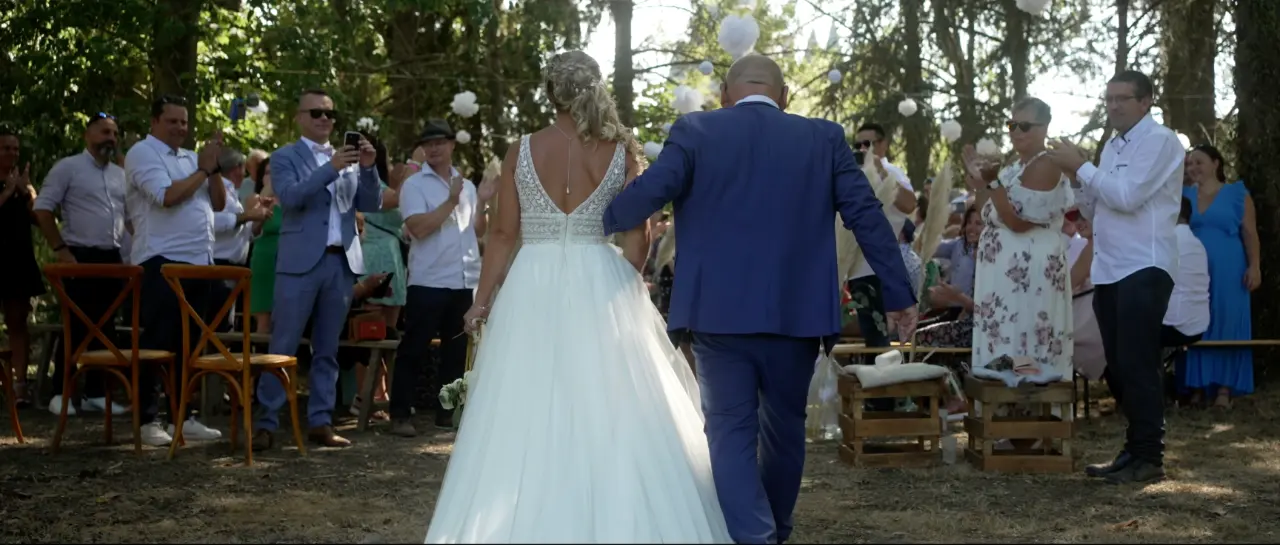 L'arrivée de la mariée accompagné de son papa sur la cérémonie d'échange de voeux. Un moment festif avant les larmes d'émotions. Par chance ce jour de cannicule, on a bénéficié d'un endroit ombragé sous les arbres.