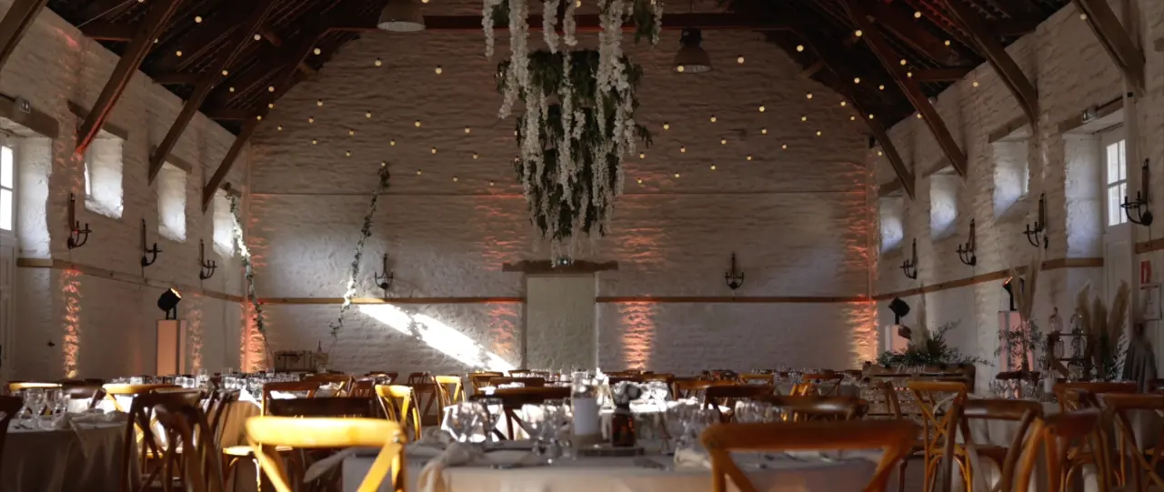 La grande salle du château de Bonnefontaine ou le diner de mariage a été servi. Belle décoration en suspension avec guirlandes, totems et par Led au sol.