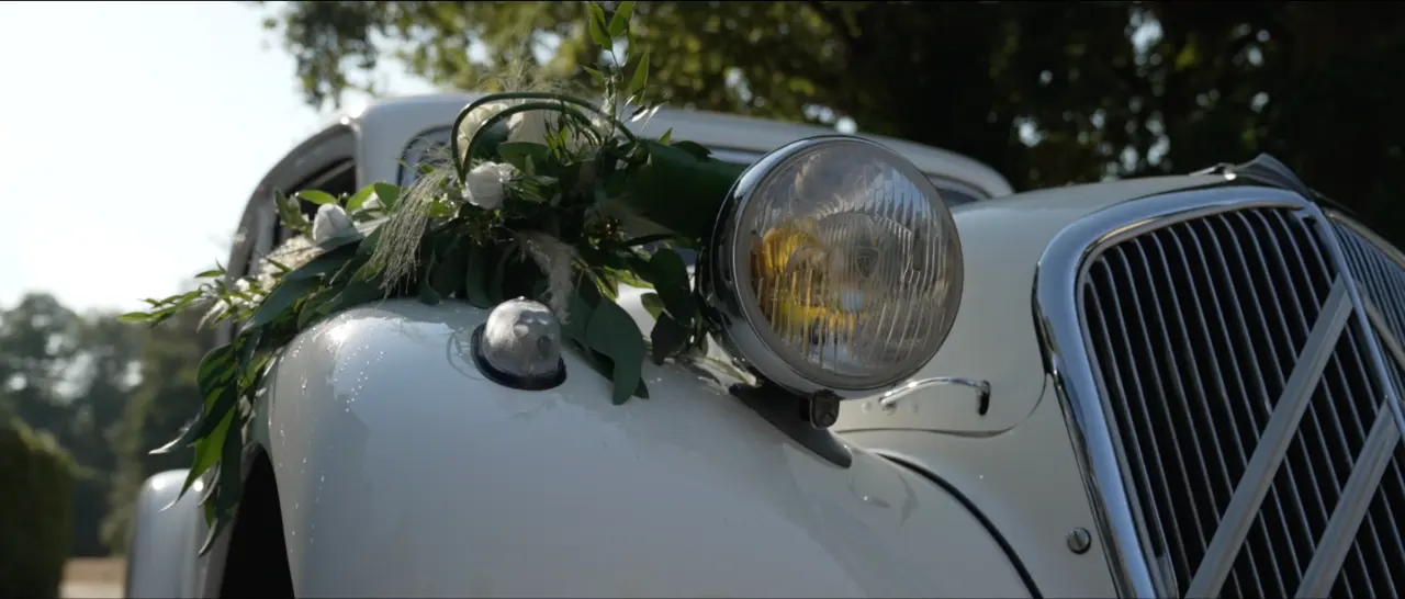 Le souci du détail avec une petite déco florale de la voiture des mariés.