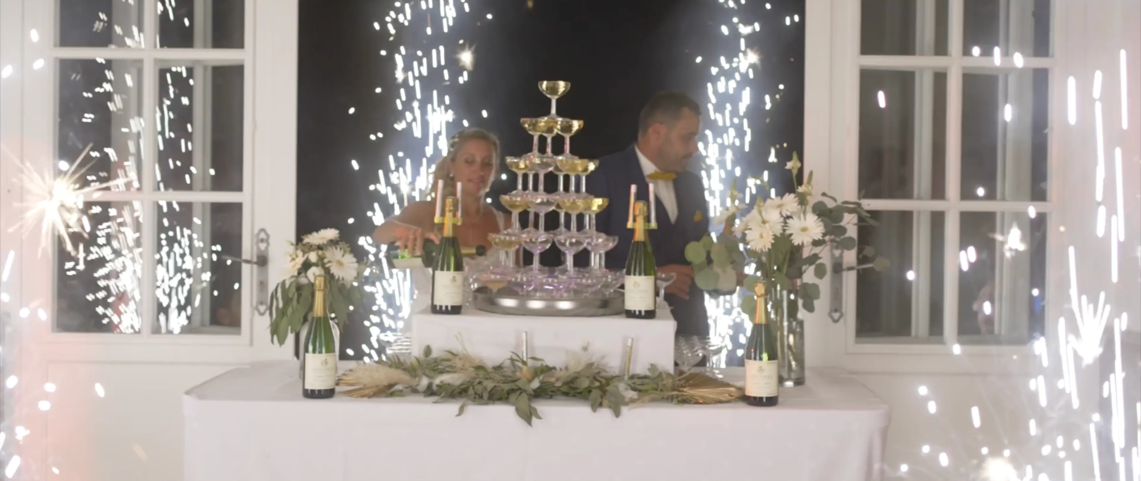Encore un grand moment : la présentation de la fontaine à champagne, agrémentée de six boîtes à étincelles froides pour un effet des plus spectaculaires. Contrairement au diner la présentation s'est déroulée dans la salle de bal. Le château offre la possibilité de distinguer plusieurs espaces de réception pour votre mariage.