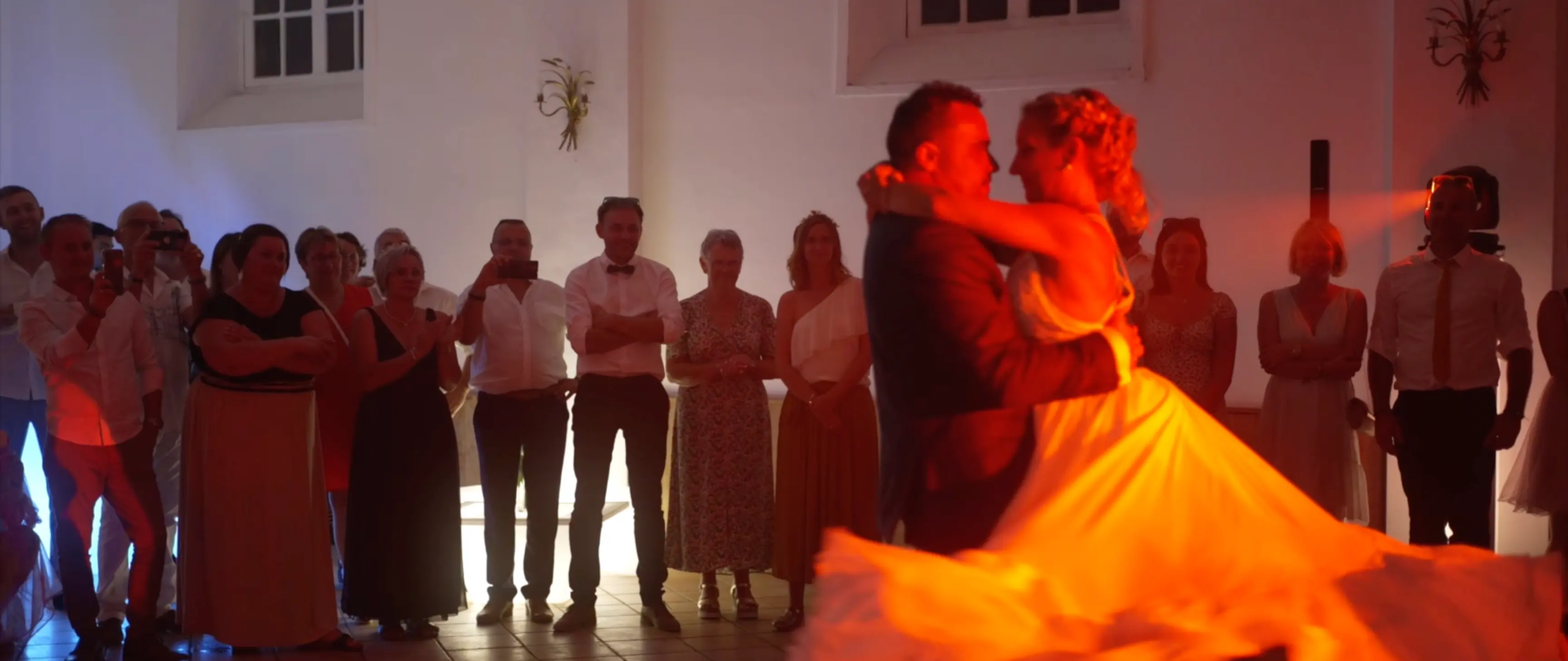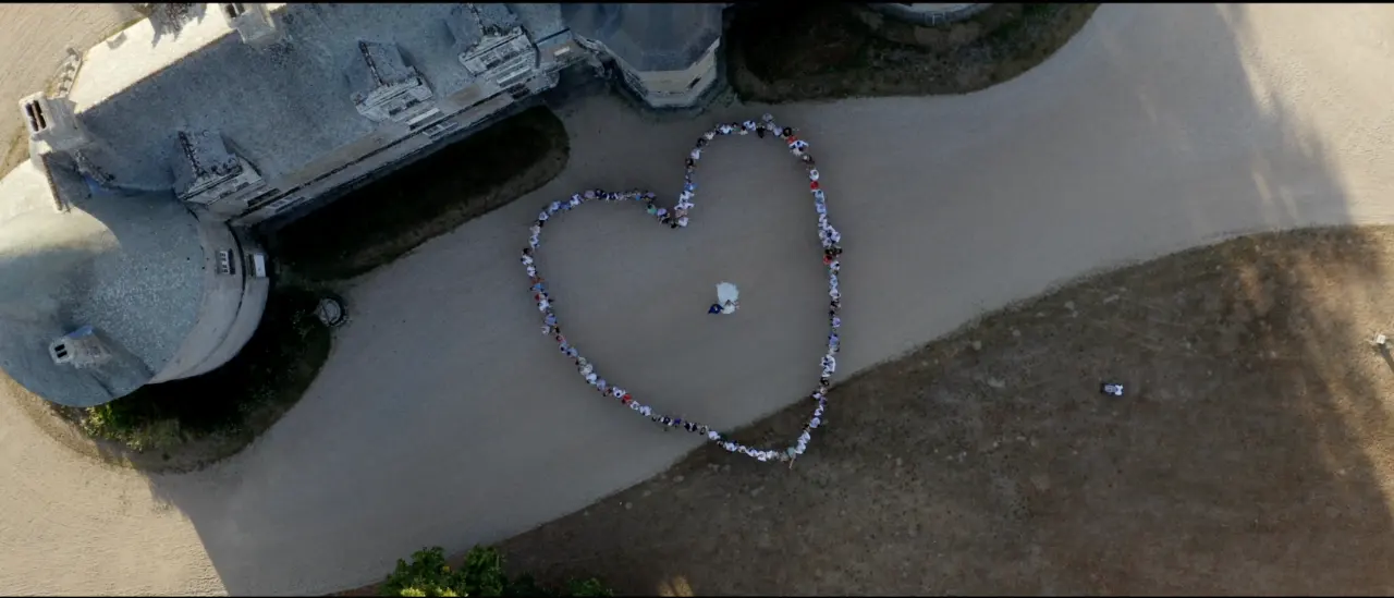 Un grand moment de la vidéo de mariage. Réalisé juste avant l'entrée en salle, beaucoup de discipline de la part des 150 convives pour organiser ce coeur et faire décoller le drone en moins de 10 mn. On aperçoit les mariés au centre, le drone à démaré 1m50 au dessus d'eux.