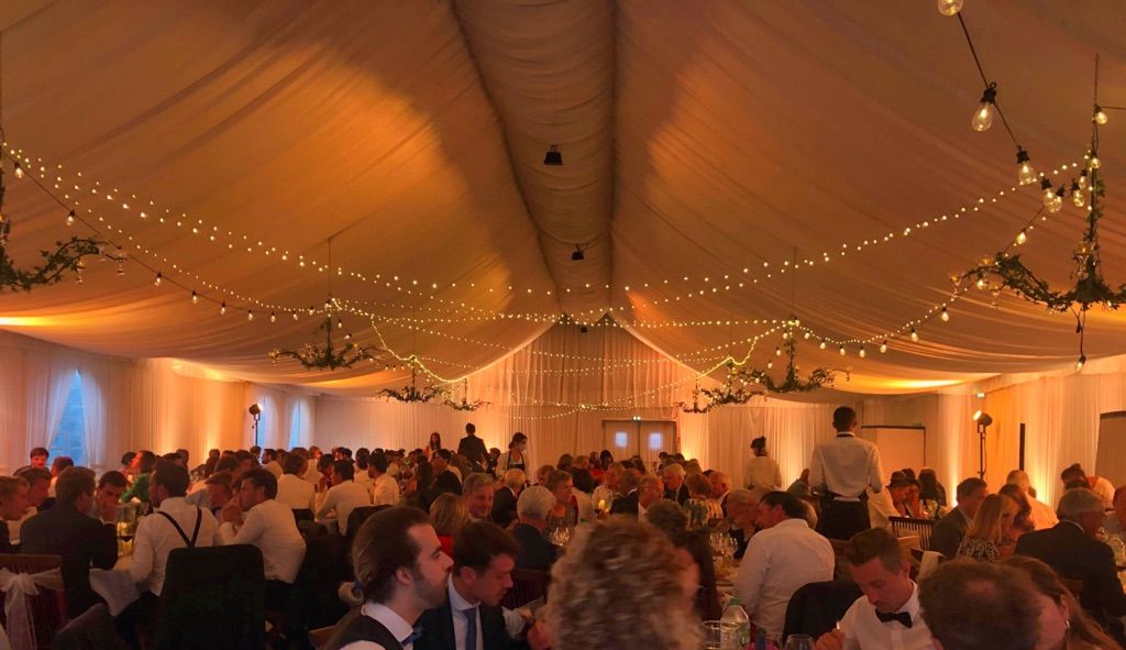 La tente de réception possède un éclairage au sol (uplight) afin d'optimiser cette mise en lumière nous ajoutons un éclairage direct sur le vélum, ainsi que différentes guirlandes types guinguettes et filaments. Cela nous permet d'obtenir un éclairage cosy et suffisamment lumineux pour le dîner de mariage.