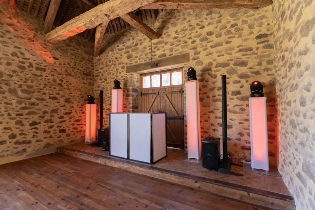Jadis, Sonofactory posait la régie DJ dans le pigeonnier qui surplombe la piste de danse, mais pour des raisons évidentes de sécurité, la sono est à présent installé au même niveau que les danseurs. Cette orangerie a une bonne acoustique et deux systèmes Bose (voir photo ci-dessous) suffisent largement à sonoriser la soirée dansante.